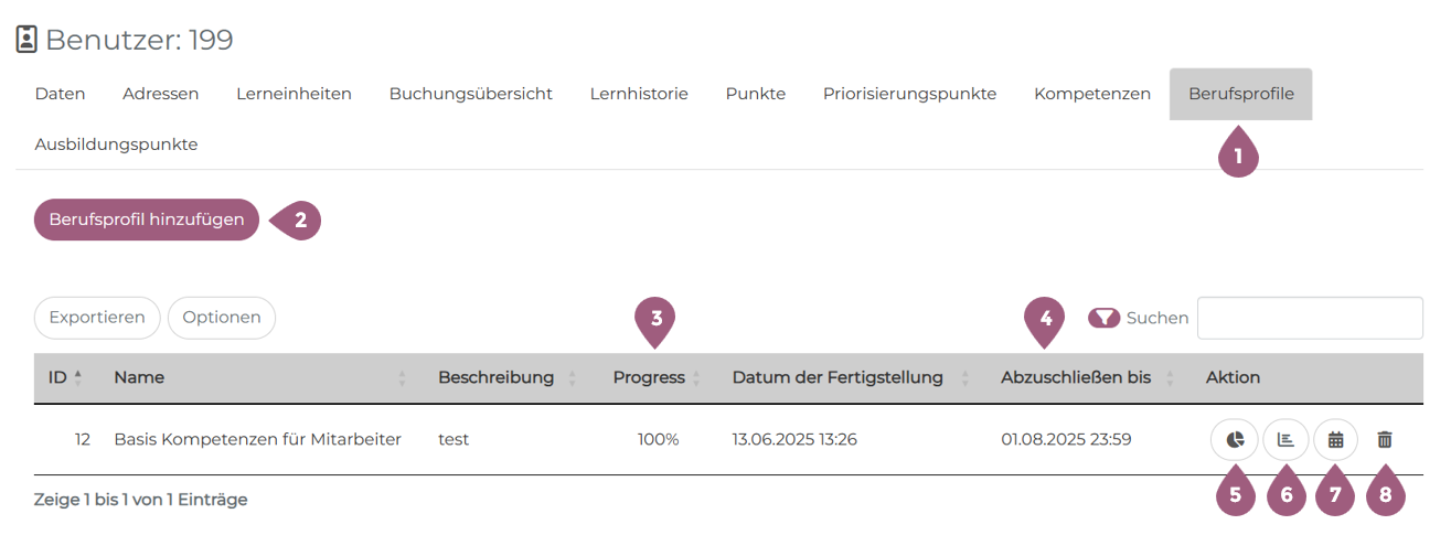 Unter Benutzer > Benutzer > Benutzer bearbeiten > Benutzerprofil finden Sie den Reiter „Berufsprofile“(1). Dort sehen Sie alle dem Benutzer zugewiesenen Profile. Mit einem Klick auf „Berufsprofil hinzufügen“ (2) können Sie dem Benutzer ein oder mehrere Profile zuweisen. Die Tabelle zeigt den Fortschritt sowie das Fertigstellungsdatum. Der Progress wird anhand der Gesamtzahl der Kompetenzstufen berechnet, die der Benutzer erreichen muss (3). Optional können Sie ein Zieldatum festlegen, bis wann das Profil abgeschlossen sein soll (4). Dieses Datum dient nur als Hinweis und löst keine Benachrichtigungen aus. In der Spalte „Aktion“ stehen Ihnen folgende Optionen zur Verfügung: Hinweis: Beim Entfernen eines Berufsprofils bleiben die Kompetenzen des Benutzers bestehen. Um diese ebenfalls zu entfernen, löschen Sie die entsprechenden Einträge unter dem Reiter „Kompetenzen“ im Benutzerprofil.Benutzerprofile: Berufsprofile