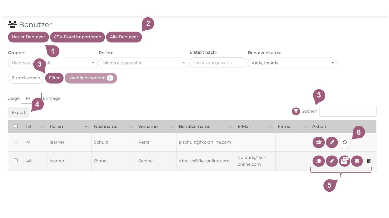 Unter Administration > Benutzer finden Sie eine Liste aller im LMS vorhandenen Benutzer.