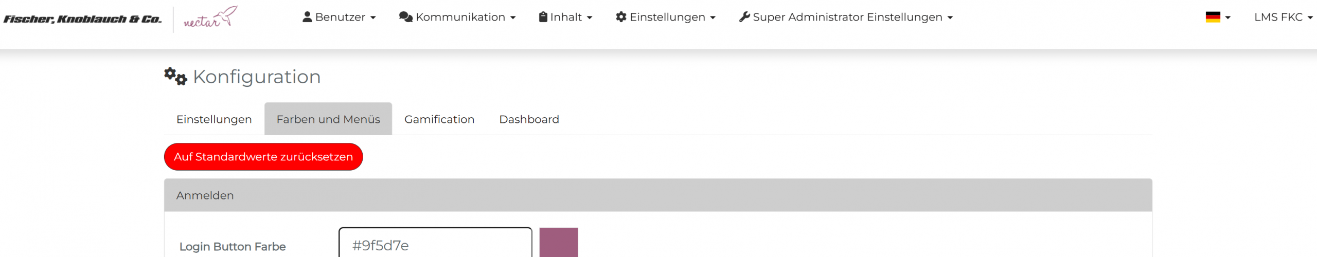 Unter Administration > Einstellungen > Konfiguration > Farben und Menüs > im Bereich “Button Farbe” können Sie die Farben für die Buttons / Schaltflächen Ihres LMS anpassen.