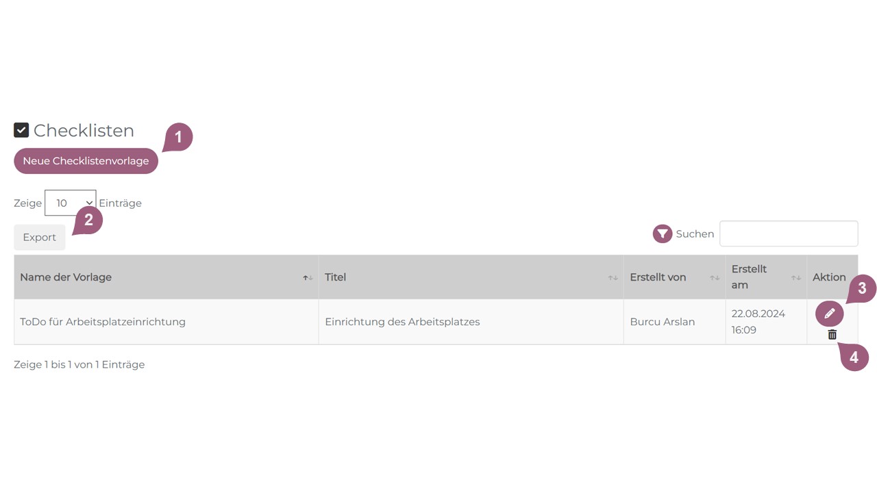 Über Administration > Einstellungen > Checklisten gelangen Sie auf die Übersicht der Checklisten, die bereits erstellt wurden. Mit Klick auf „Neue Checklistenvorlage“ (1) haben Sie die Möglichkeit, neue Checklisten zu erstellen. Sie können die Checklisten aus der Liste exportieren (2) und als Excel-Datei abspeichern. Checklisten, die aufgelistet sind, können Sie mit dem Editiersymbol (3) bearbeiten und mit dem Papierkorbsymbol (4) löschen. Hinweis: Wenn die Checkliste bereits einer Lerneinheit zugewiesen wurde, verschwindet das Papierkorbsymbol, um es löschen zu können, darf die Checkliste keinem Lernelement zugewiesen sein.
