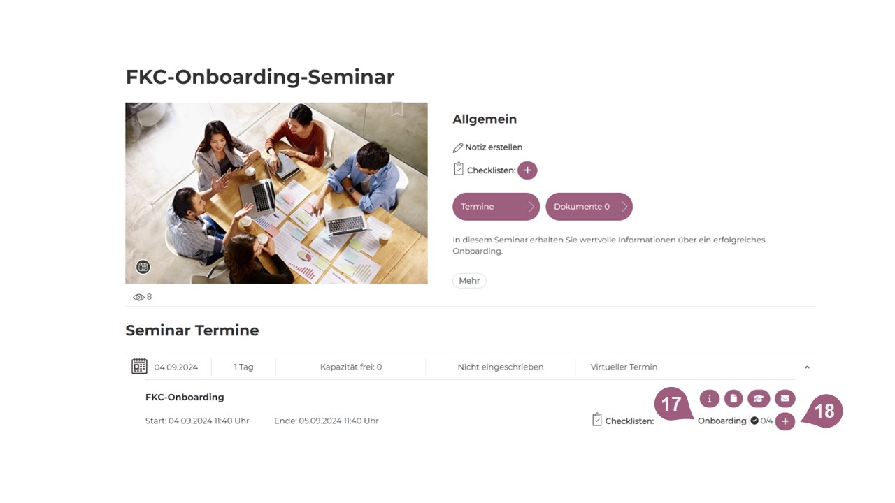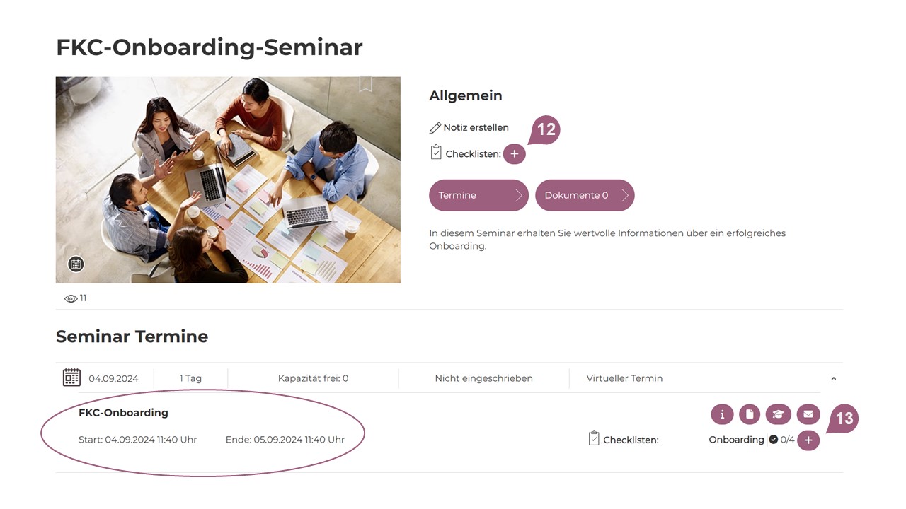 Bei Seminaren besteht die Möglichkeit, Checklisten auch einem Termin hinzuzufügen. Dies ist ebenfalls über das „+“ – Symbol (13) möglich.