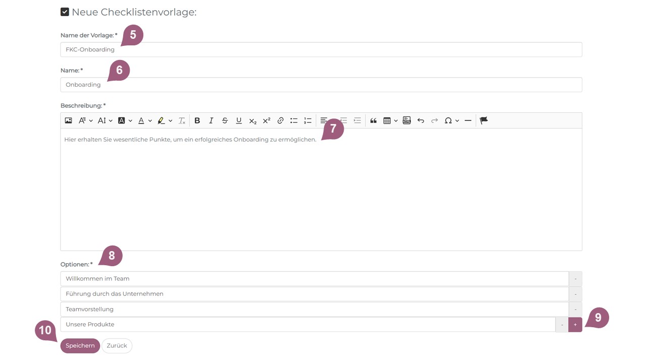 Um eine neue Checklistenvorlage zu erstellen, geben Sie zunächst den Namen der Vorlage (5), den Namen der Checkliste (6), die Beschreibung (7) und die Optionen (8) an.