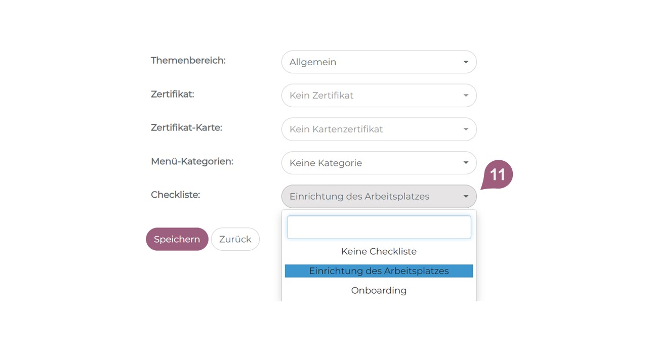 Beim Erstellen von neuen Lernelementen fügen Sie die Checklisten über den Reiter „Allgemein“ hinzu, dafür klicken Sie die gewünschte Checkliste (11) an.