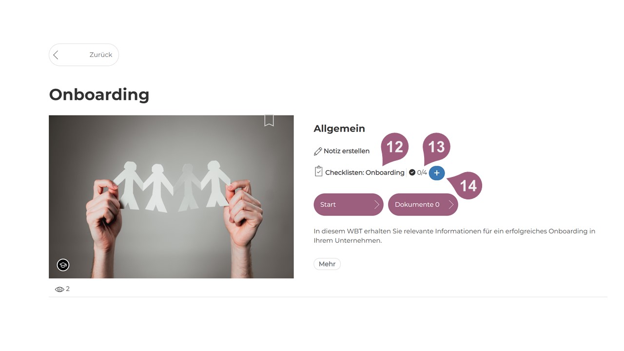 Nachdem Sie die Checkliste markiert und somit der Lerneinheit zugewiesen haben, erscheint diese in der Lernerübersicht. Mit Klick auf die Checkliste (12) öffnet sich ein Pop-up Fenster mit den Optionen, die Sie zuvor bei der Erstellung angegeben haben. Die Zahl (13) neben der Checkliste verdeutlicht die Anzahl der zu erledigenden Optionen, welche seitens der Lernenden individuell abgehakt werden können. Das „+“ – Symbol (14) ermöglicht, dass die Lernenden eigene Checklisten einbinden können. Dabei öffnet sich ein weiteres Pop-up Fenster und es besteht die Option aus Vorlagen eine Checkliste einzubinden oder eine neue zu erstellen.