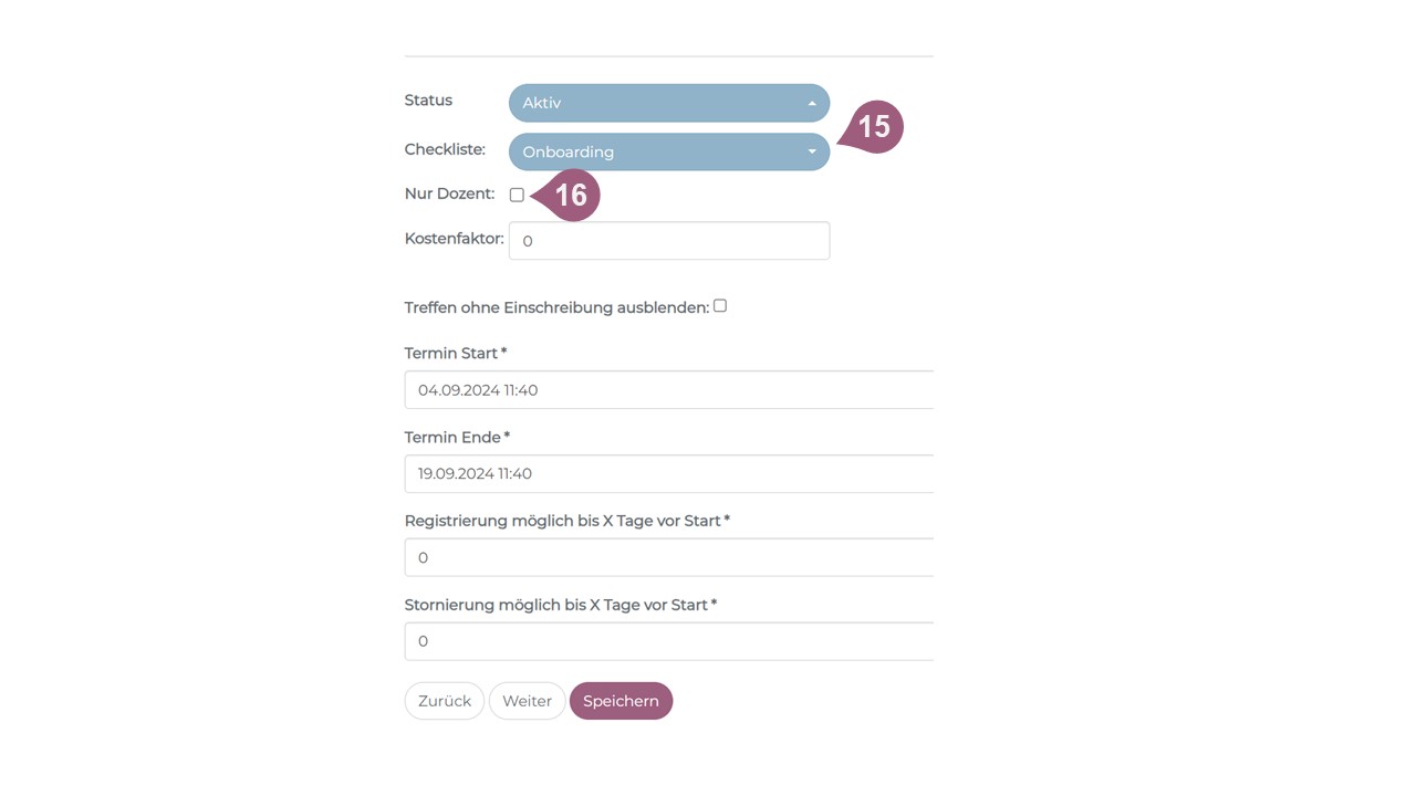Wie erwähnt, besteht auch die Möglichkeit, eine Checkliste einem Meeting zuzuweisen, diese erfolgt über die Erstellung eines Seminars. Wenn Sie einen Termin für ein Seminar anlegen, haben sie die Option, diesem Termin eine Checkliste (15) zuzuordnen. Mit Häkchen auf „Nur Dozent“ (16) können Sie frei entscheiden, ob diese Checkliste innerhalb des Termins nur für die Dozenten sichtbar sein soll oder für alle Lernenden zu sehen sein soll.