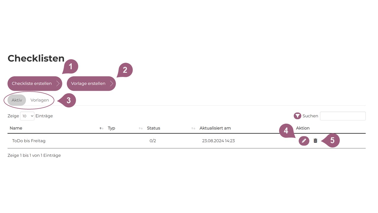 Über den Reiter „Aktiv“ (3) und „Vorlagen“ (3) können die erstellten Checklisten eingesehen werden. Mit dem Editiersymbol (4) kann die Checkliste bearbeitet und über das Papierkorbsymbol (5) gelöscht werden.