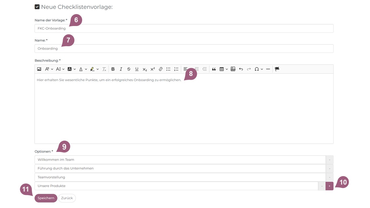 Im Anschluss können Sie den Vorgang speichern (11) und ihre Checklistenvorlage erscheint in der Übersicht.