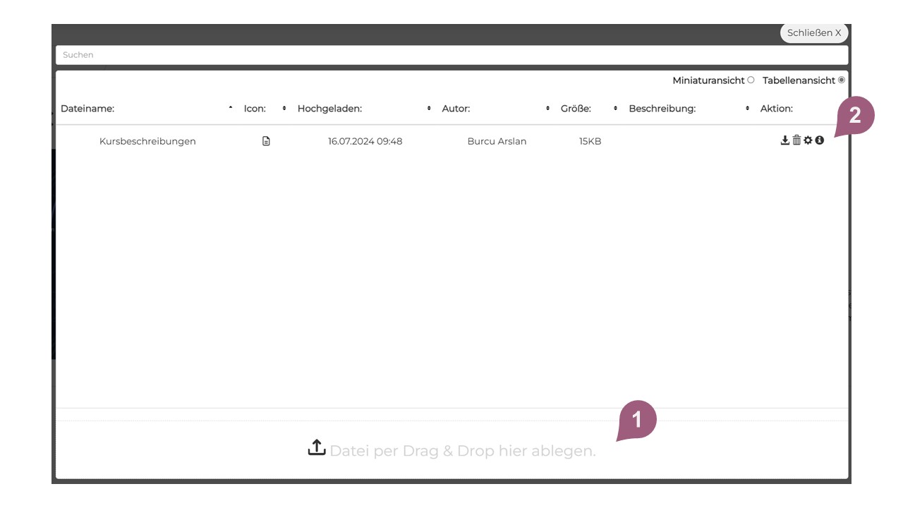 Durch Klick auf das Feld „Dokumente“ beim entsprechenden Lernelement, können Sie die Datei auf das „Drag & Drop“- Feld (1) ziehen.