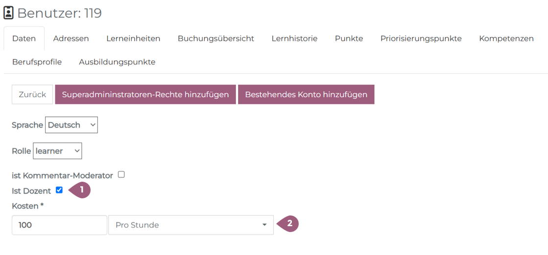 Dozenten können im Benutzerprofil angelegt werden. Mit dem Häkchen „Ist Dozent“ (1) erhält der Benutzer Dozentenrechte. Zusätzlich kann auch das Honorar des Dozenten festgelegt werden (2).
