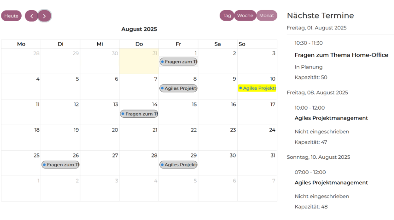 Das Dozenten-Dashboard kann unter den Gruppen-Einstellungen aktiviert werden. Dort sieht der Dozent alle ihm zugewiesenen Termine. Termine, bei denen der Dozent als solcher hinterlegt ist, werden gelb markiert. Grau markierte Termine sind solche, bei denen der Dozent als Lerner angemeldet ist.