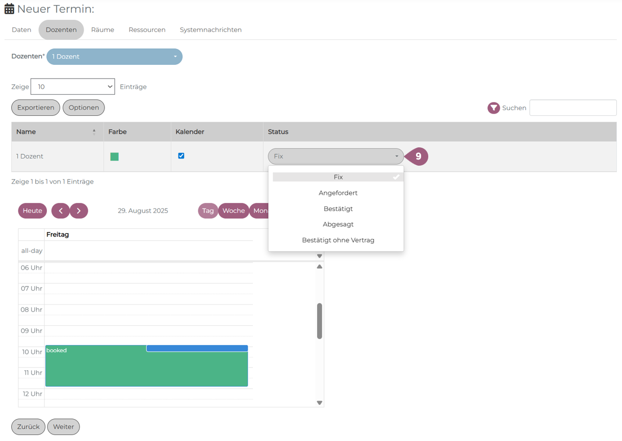 Es ist möglich, von einem Dozenten zu verlangen, ein Seminar zu akzeptieren. In diesem Fall erhält der Dozent eine E-Mail mit der entsprechenden Anfrage. Sobald er das Seminar angenommen hat, kann er die Teilnehmer verwalten. Lehnt der Dozent die Anfrage ab, erhält der Seminarersteller eine Benachrichtigung, und der Status in den Termin-Einstellungen wird auf „Abgesagt“ aktualisiert. Der Dozent des Seminars bleibt unbesetzt, bis ein neuer ausgewählt wurde.