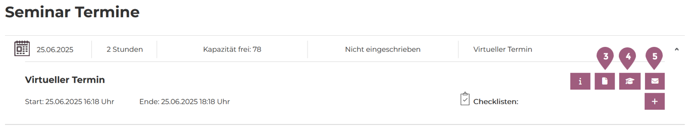 In der Seminarübersicht im Lernerbereich stehen Dozenten drei Aktionen zur Verfügung: Dokumente hochladen (3), Teilnehmer verwalten (4) und Nachrichten an die Teilnehmer senden (5). Diese Aktionen sind nur verfügbar, wenn der Benutzer bei dem jeweiligen Seminar als Dozent hinterlegt wurde. In allen anderen Seminaren ist der Dozent ein regulärer Teilnehmer.
