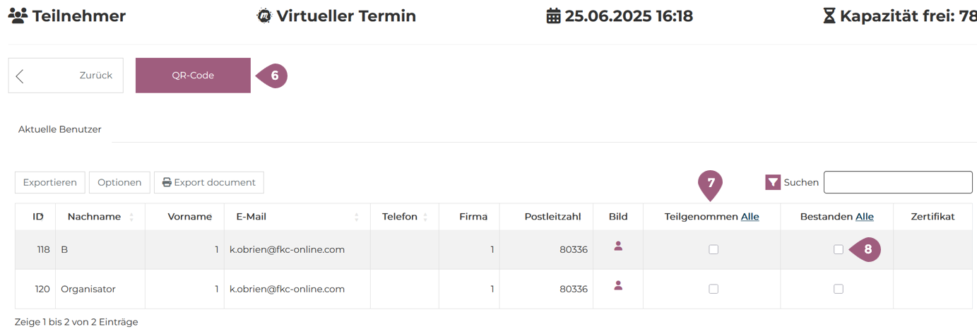 Mit einem Klick auf das Mützensymbol gelangen Dozenten zur Teilnehmerverwaltung. Dort können sie eine QR-Code für die Teilnahmebestätigung für einen Termin / Meeting generieren (6), die Teilnahme bestätigen (7) und das Seminar als „Bestanden“ markieren (8).