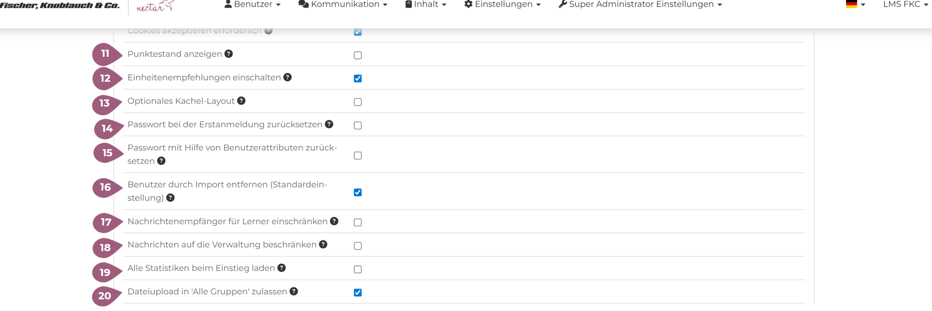 (18) Nachrichten auf die Verwaltung beschränken: Wenn diese Funktion aktiviert ist, können nur die Administratoren Nachrichten senden. Die Lernenden können nur auf die Nachrichten von Administratoren antworten.
