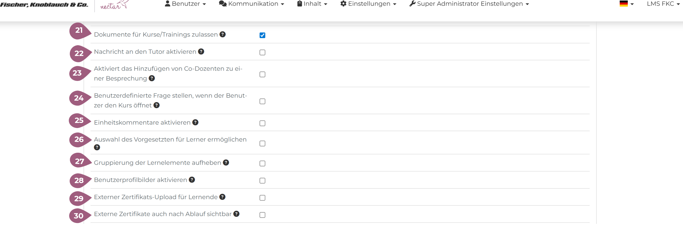 (21) Dokumente für Kurse/Trainings zulassen: Wenn diese Funktion aktiviert ist, können die Lernenden den Button “Dokumente” in der Kurs-, Training-, und Kursreihebeschreibung sehen und dort Dokumente hochladen. Damit dies funktioniert, muss die Funktion “Datei-Upload für Lerner zulassen” ebenfalls aktiviert sein.