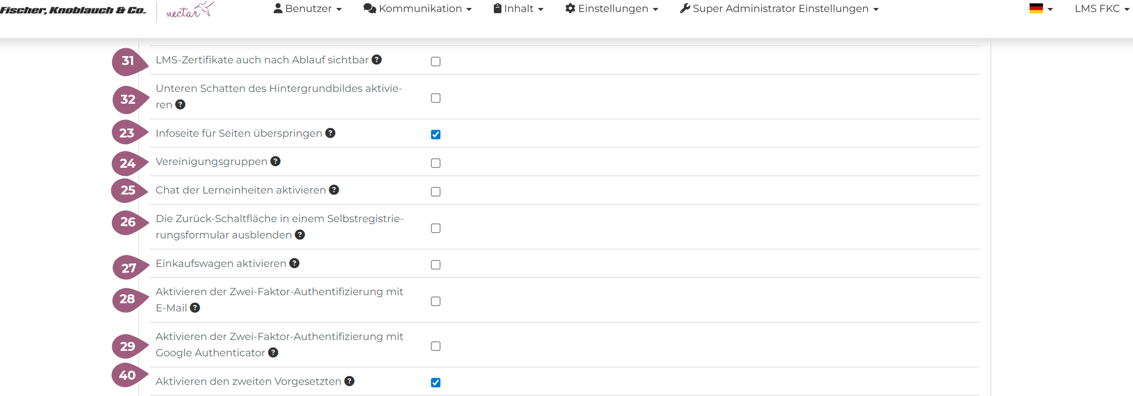 (26) Auswahl des Vorgesetzten für Lerner ermöglichen: Wenn diese Funktion aktiviert ist, können die Lernenden selbst einen Vorgesetzter auswählen.