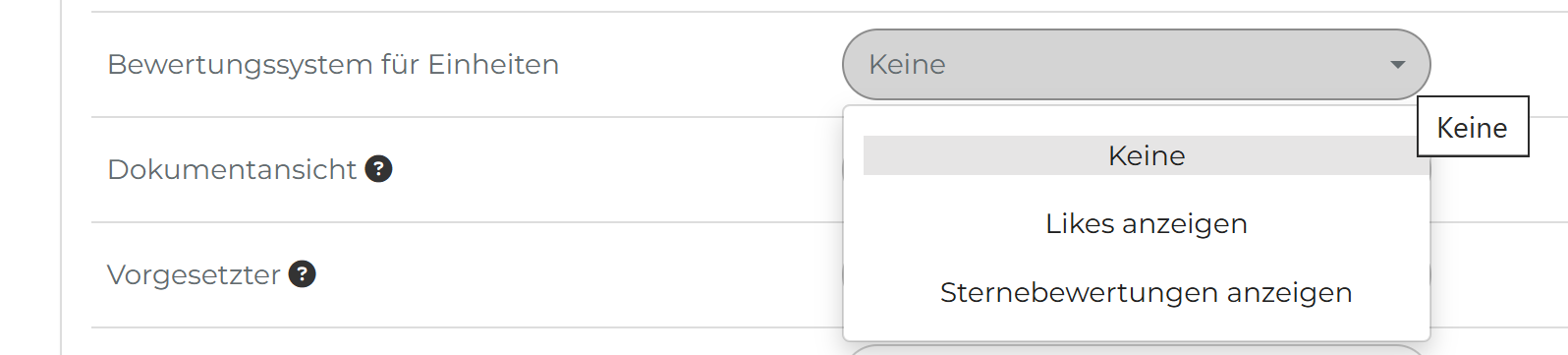 (42) Bewertungssystem für Einheiten: Hier können Sie die Bewertung von Einheiten anpassen. Sie können keine Bewertung, nur die Likes oder nur Sternebewertungen anzeigen lassen:
