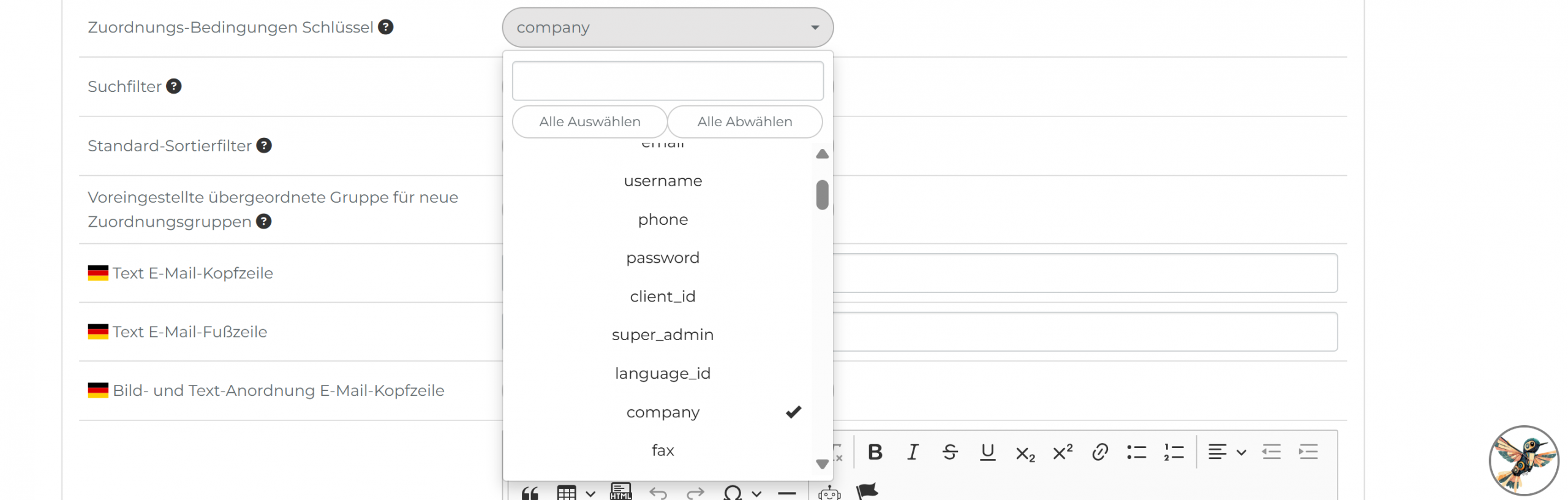 (47) Zuordnungs-Bedingungen Schlüssel: Hier können Sie festlegen, welche Schlüssel für die Erstellung von automatischen Gruppenzuweisungen möglich sein sollen. Nur diese Benutzereigenschaften, die Sie hier angeklickt haben: