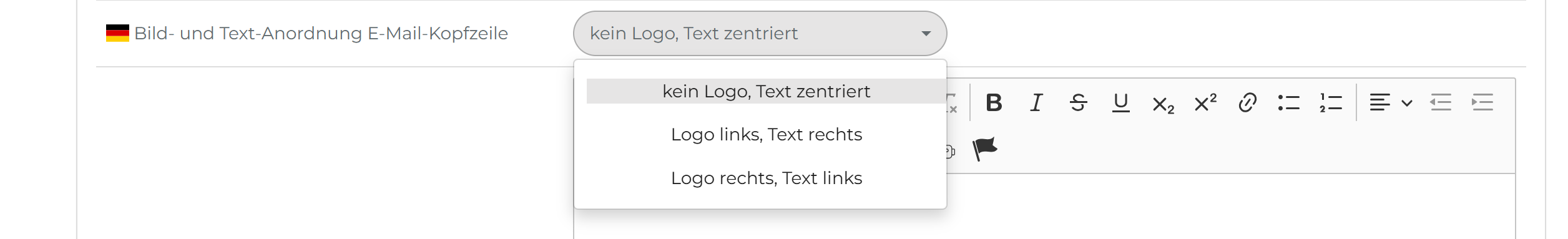 (53) Bild- und Text-Anordnung E-Mail-Kopfzeile: Hier können Sie die Anordnung der Bilder (Logo) und des Texts der E-Mail-Kopfzeile anpassen:
