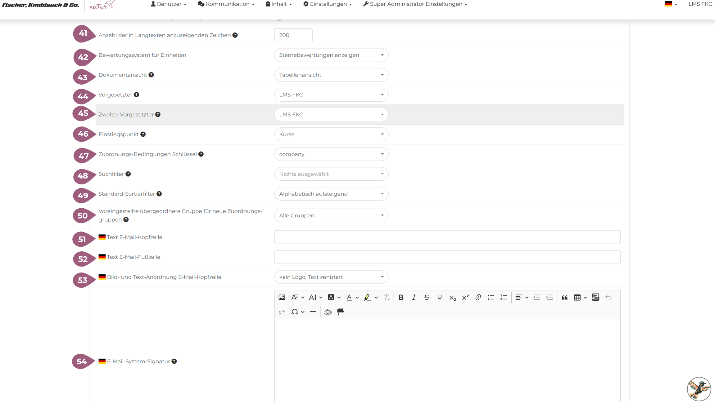 (44) Vorgesetzter: Hier können Sie den Standard-Vorgesetzter (Supervisor) für den aktuellen Mandanten festlegen. Der wird bei allen Benutzer als Default-Vorgesetzter vom LMS ausgewählt, wenn kein Vorgesetzter festgelegt wird.