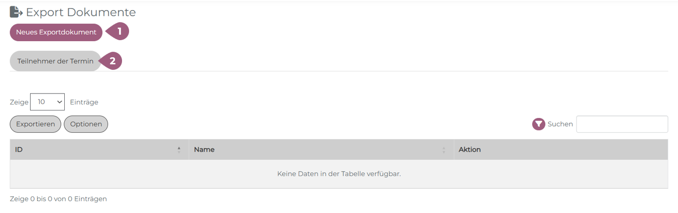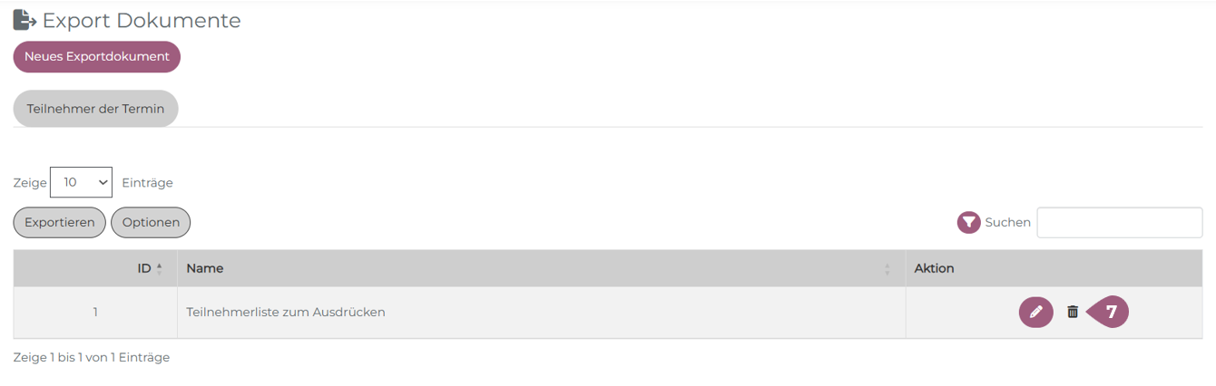 In der Übersichtstabelle ist es möglich, die Export-Dokumente zu bearbeiten (Stiftsymbol) oder zu löschen (Mülleimersymbol) (7).