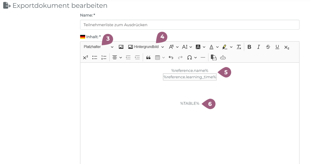 Export-Dokumente lassen sich mithilfe von Platzhaltern (3) und Hintergrundbildern (4) anpassen. Die Platzhalter generieren die jeweiligen Informationen aus dem Seminar automatisch (5). Die Tabelle (%TABLE%) enthält die Teilnehmerliste (6). Durch Klick auf „Speichern“ wird die Vorlage erstellt.