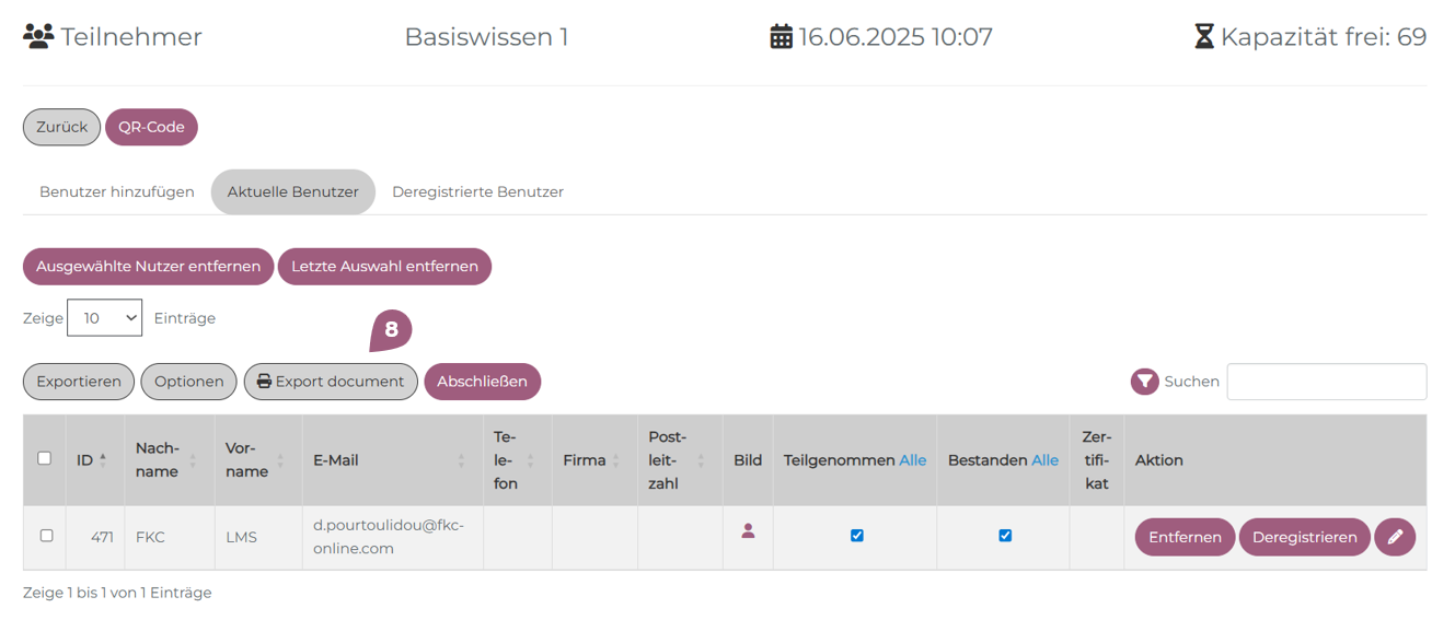 Auf der Teilnehmerlisten-Seite kann ein Export-Dokument durch Klick auf „Export Document“ erstellt werden (8).
