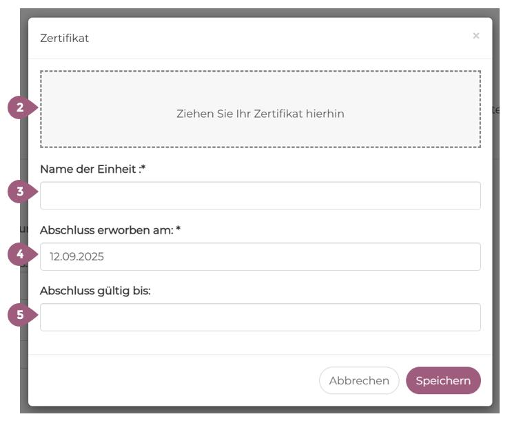 Zusätzlich zur Zertifikatsdatei (2) müssen der Name des Zertifikats (3) sowie das Abschlussdatum (4) angegeben werden. Optional kann auch ein Ablaufdatum (5) festgelegt werden. Bitte beachten Sie, dass externe Zertifikate nicht in den Statistiken berücksichtigt werden.