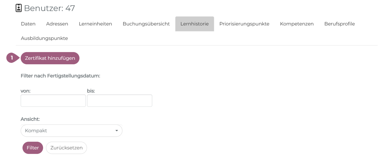 Im Benutzerprofil unter „Buchungsübersicht“ und „Lernhistorie“ ist es möglich, externe Zertifikate hochzuladen (1).
