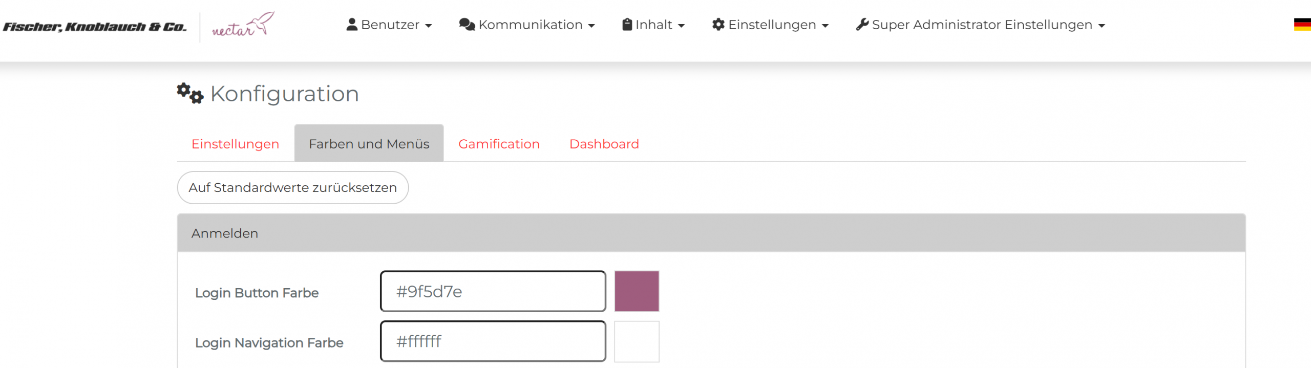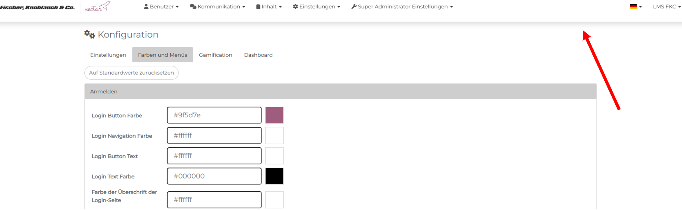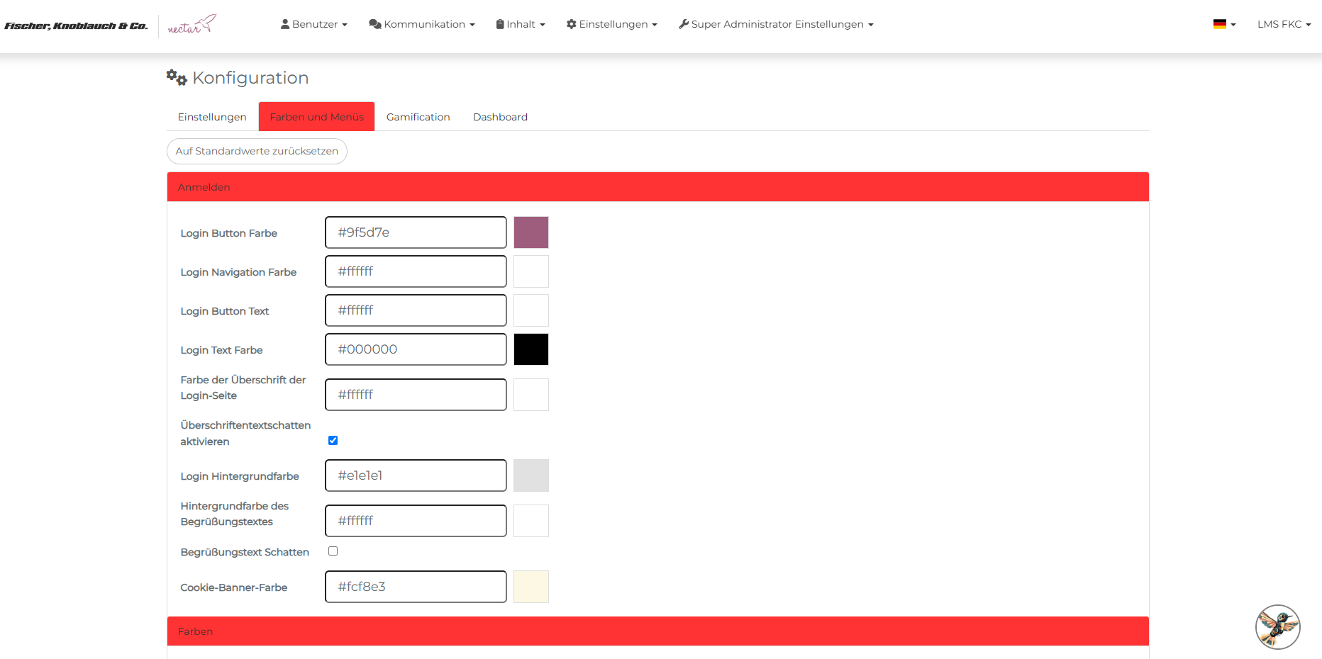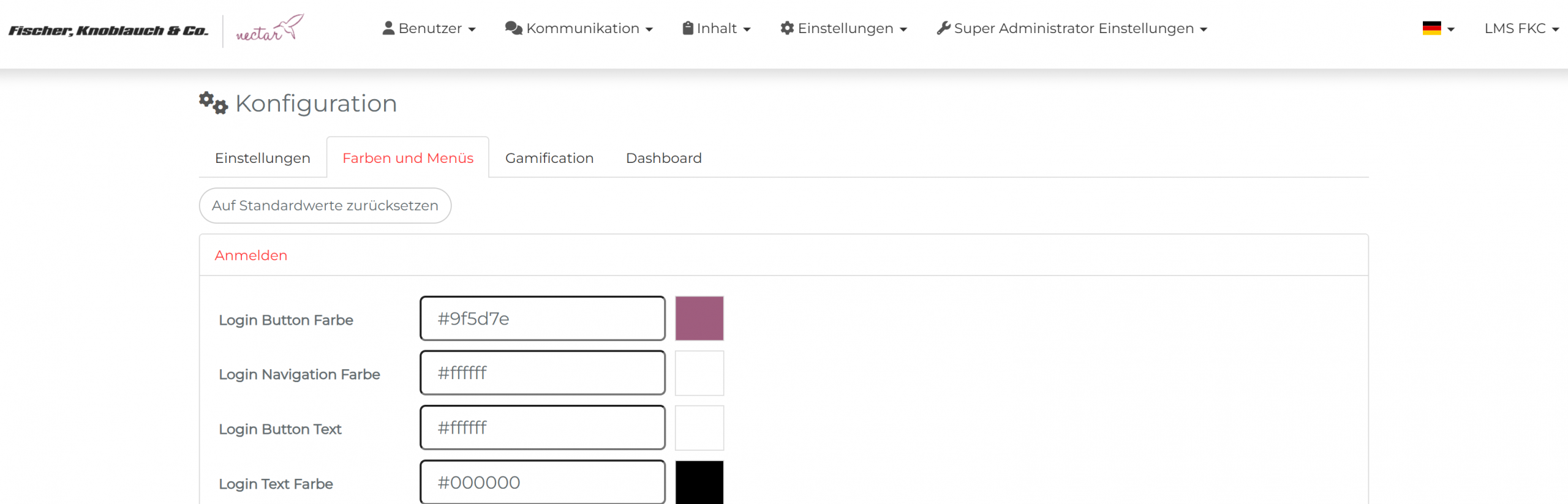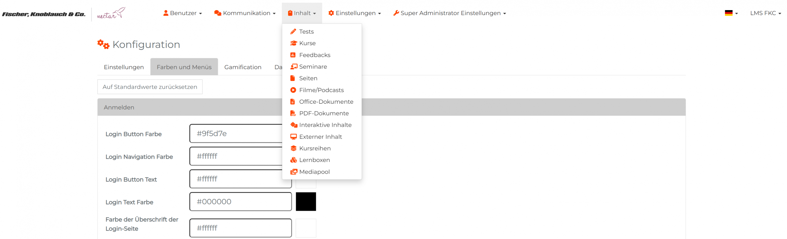 Unter Administration > Einstellungen > Konfiguration > Farben und Menüs > im Bereich “Farben” können Sie die Farbanpassungen für Ihr LMS vornehmen.