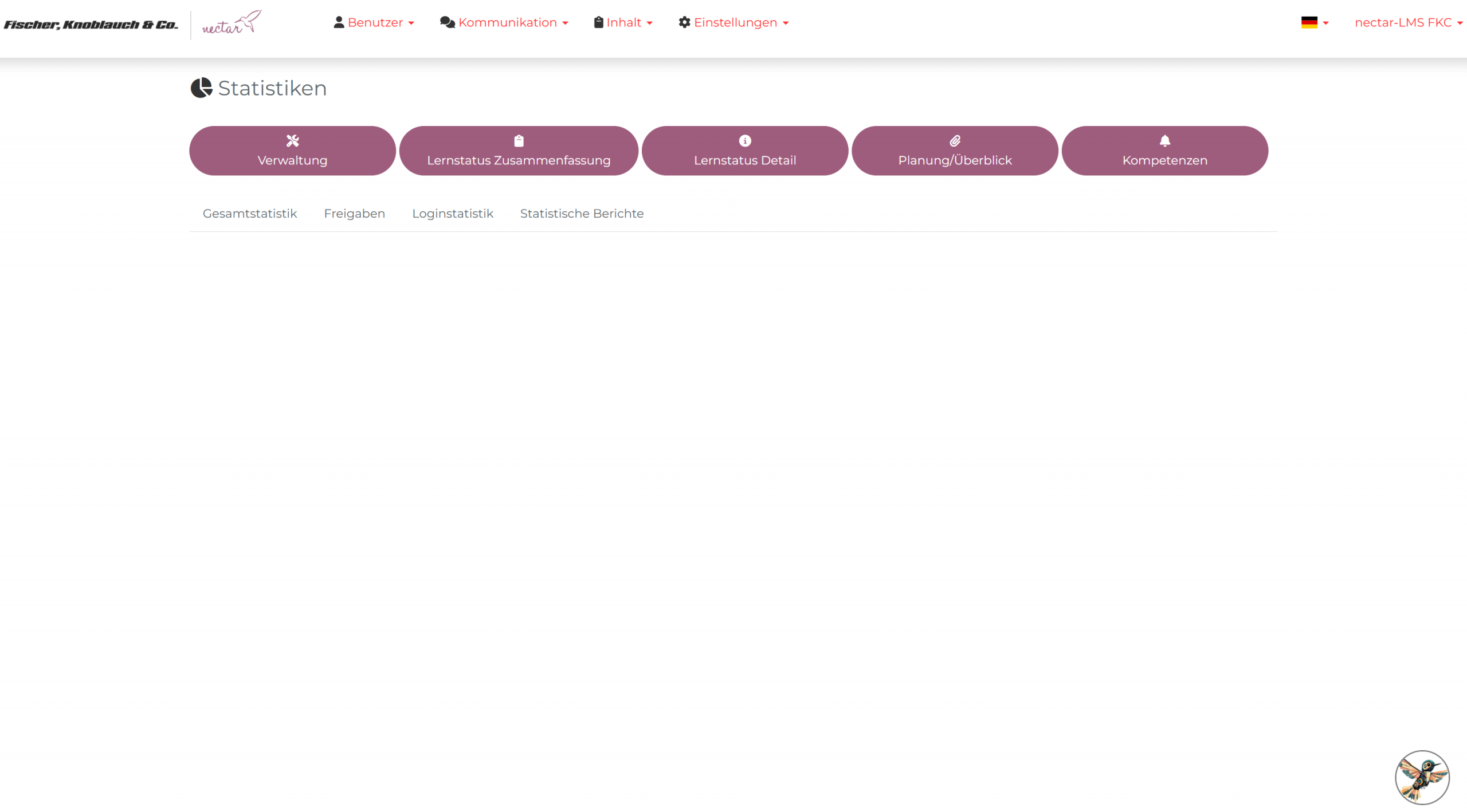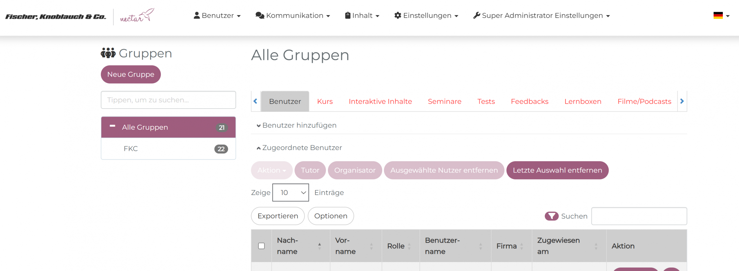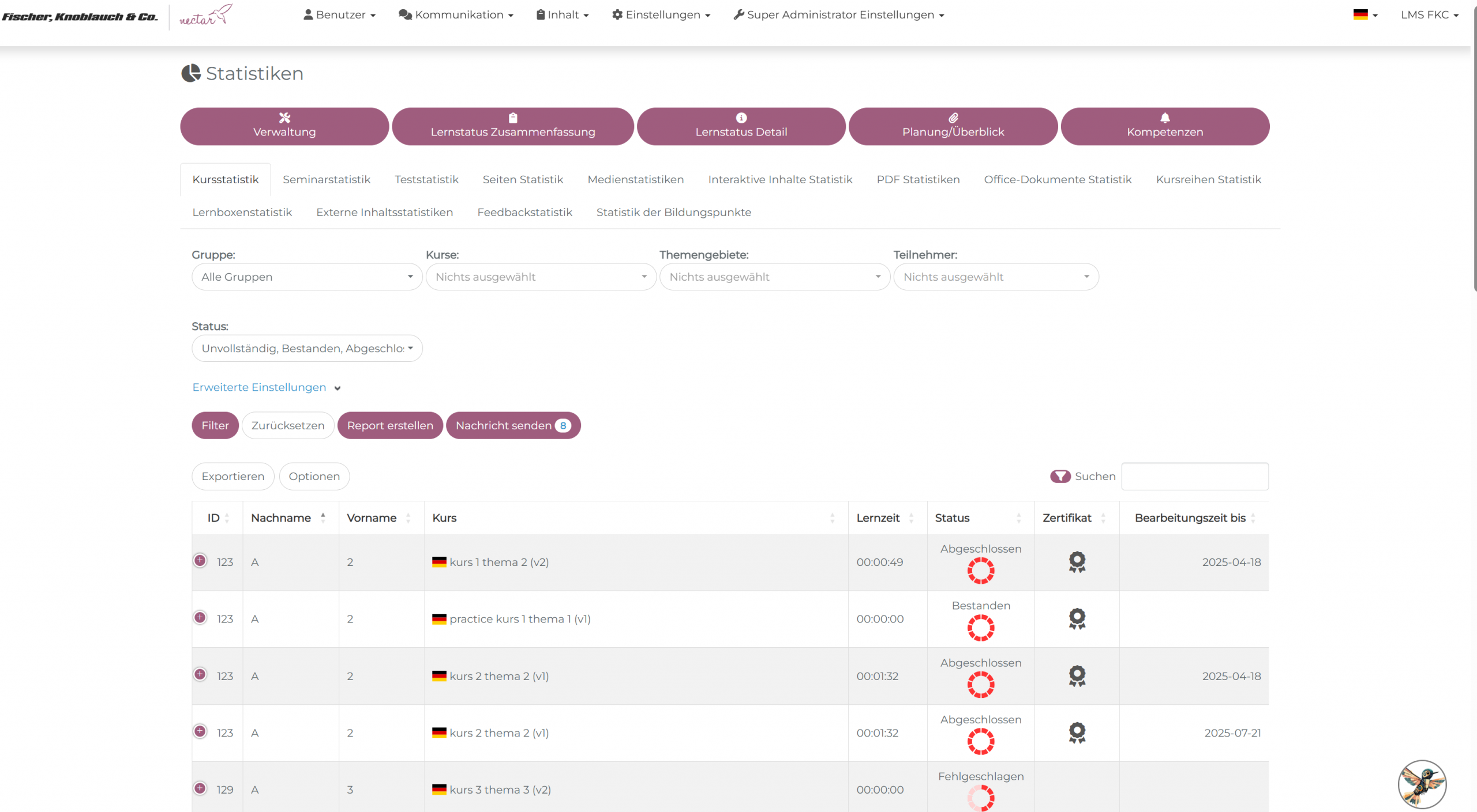 7. Tabellen Kopfzeilenfarbe: Es geht um die Farbe der Tabellen-Kopfzeilen. Ein Beispiel davon sehen Sie mit rot markiert im folgenden Screenshot. Weitere Stellen im nectar LMS wo diese Einstellung die Kopfzeile färbt, sind: im Lernerbereich unter Profil und im Administrationsbereich u.a. unter Administration > Benutzer > Benutzer, Gruppen, in den jeweiligen Statistiken, unter Administration > Inhalt > Kurse, Tests usw.
