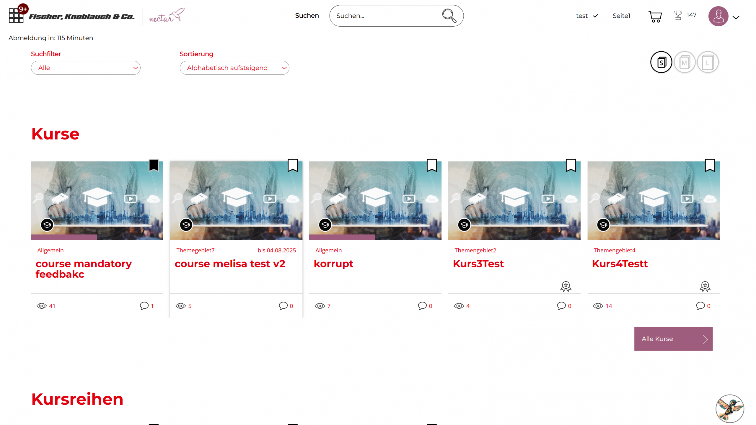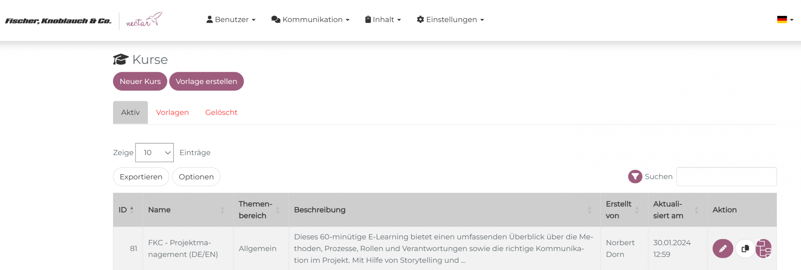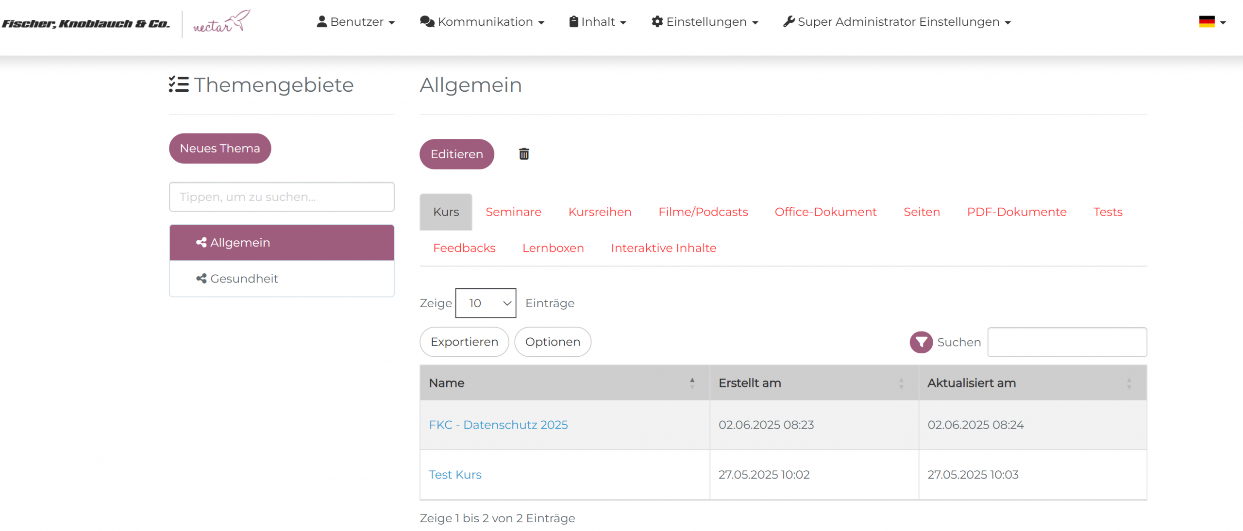 - Unter Administration > Inhalt > Kurse/Tests/ Feedbacks usw.:
