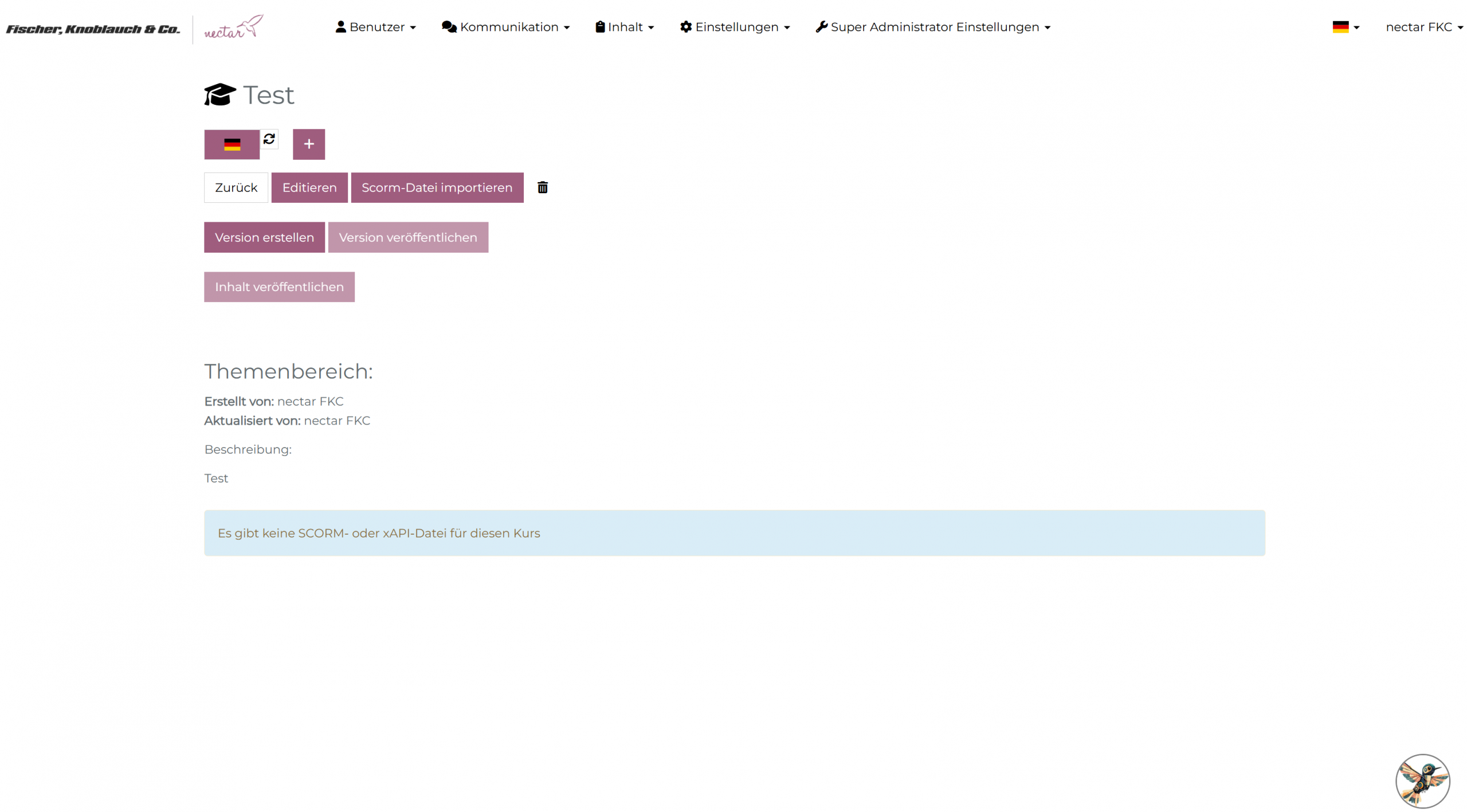 13. Farbe der Benachrichtigung: Es geht um die hellblaue Farbe von Benachrichtigungen, die eine Information enthalten – wie auf dem folgenden Screenshot, auf dem keine SCORM-Datei hochgeladen wurde: