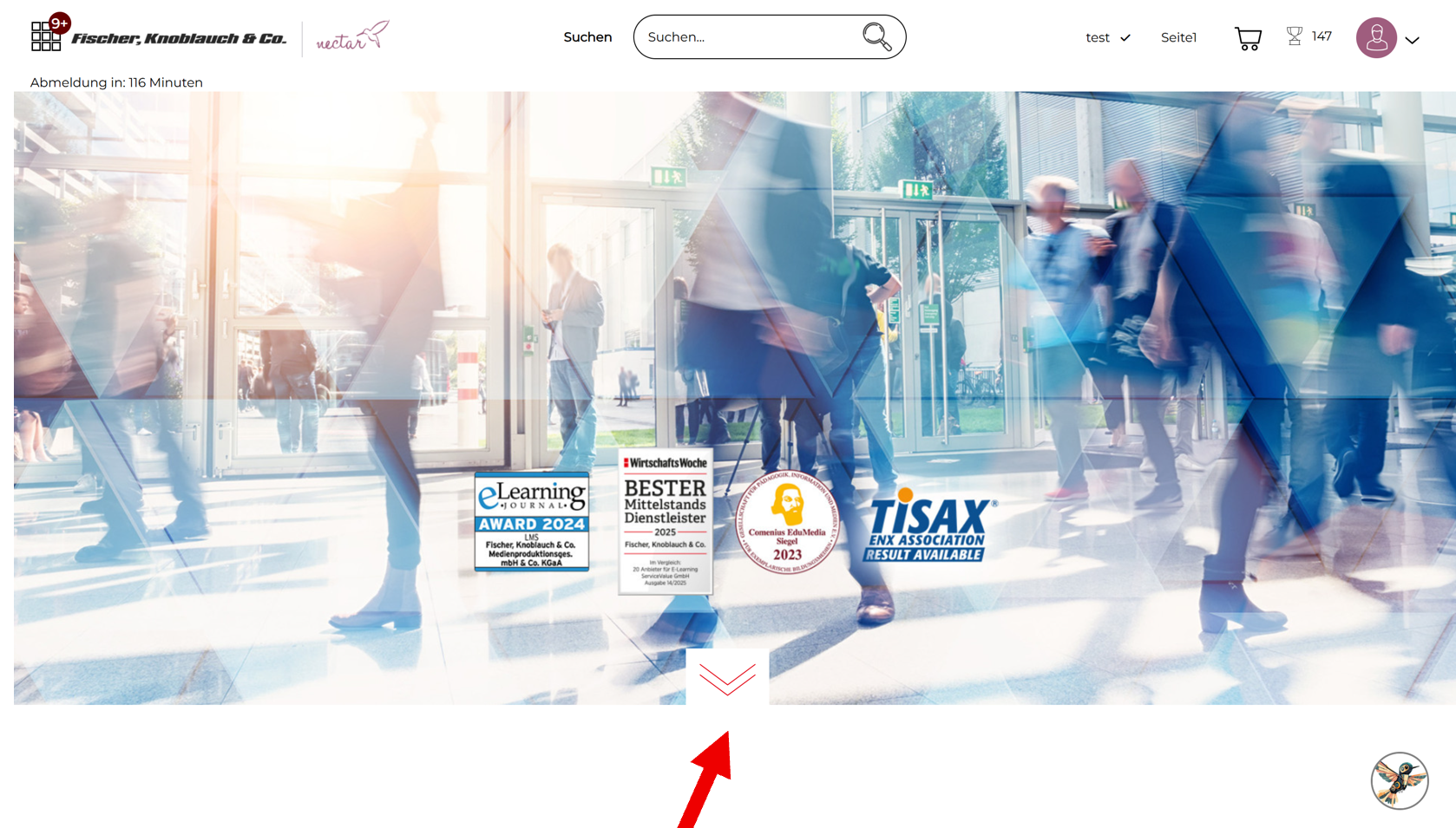 19. Farbe des Doppelpfeils: Es geht um die Farbe des Doppelpfeils auf der Startseite, um runter zu scrollen und die Lernelemente zu sehen (rot im Screenshot):