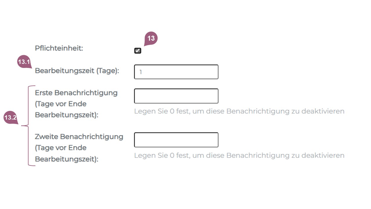 (13) Wenn die Pflichteinheit-Funktion aktiviert ist, erhalten die Lernenden eine Benachrichtigung, sobald das Feedback für sie verfügbar ist und bis wann es abzuschließen ist. Der gewünschte Bearbeitungszeitraum (13.1) sowie die Frequenz der Reminder-Nachrichten (13.2) lässt sich individuell angeben. Sobald Sie das Häkchen gesetzt haben, können Sie angeben, wann der Lernende benachrichtigt werden soll.