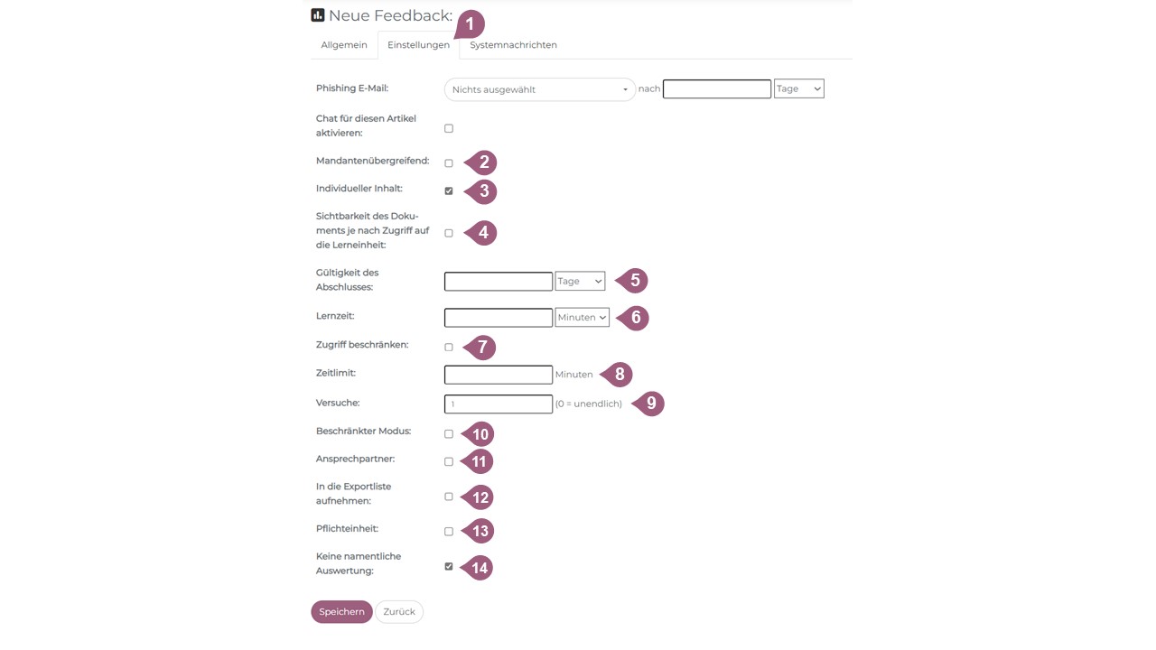 Neben den allgemeinen Angaben für Feedbacks stehen Ihnen beim Erstellen von Feedbacks unter „Einstellungen“ (1) verschiedene Zusatzoptionen zur Verfügung: