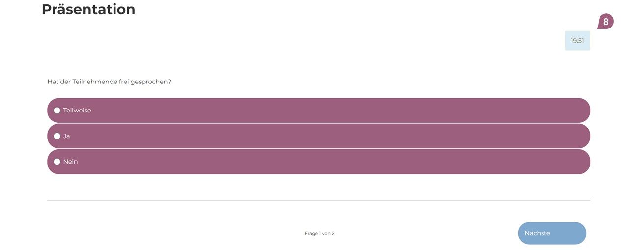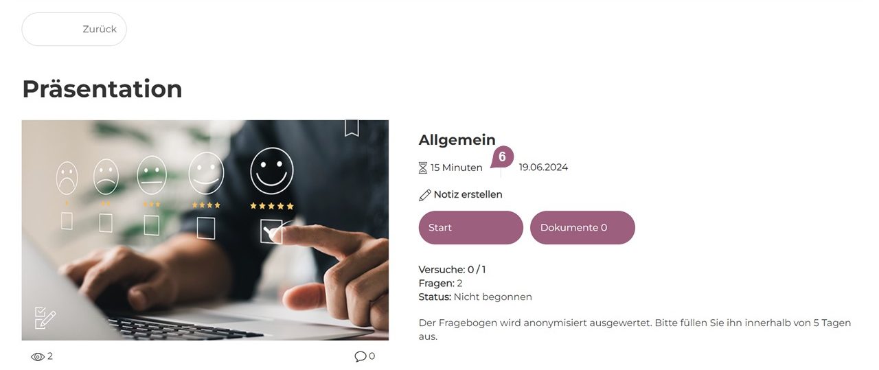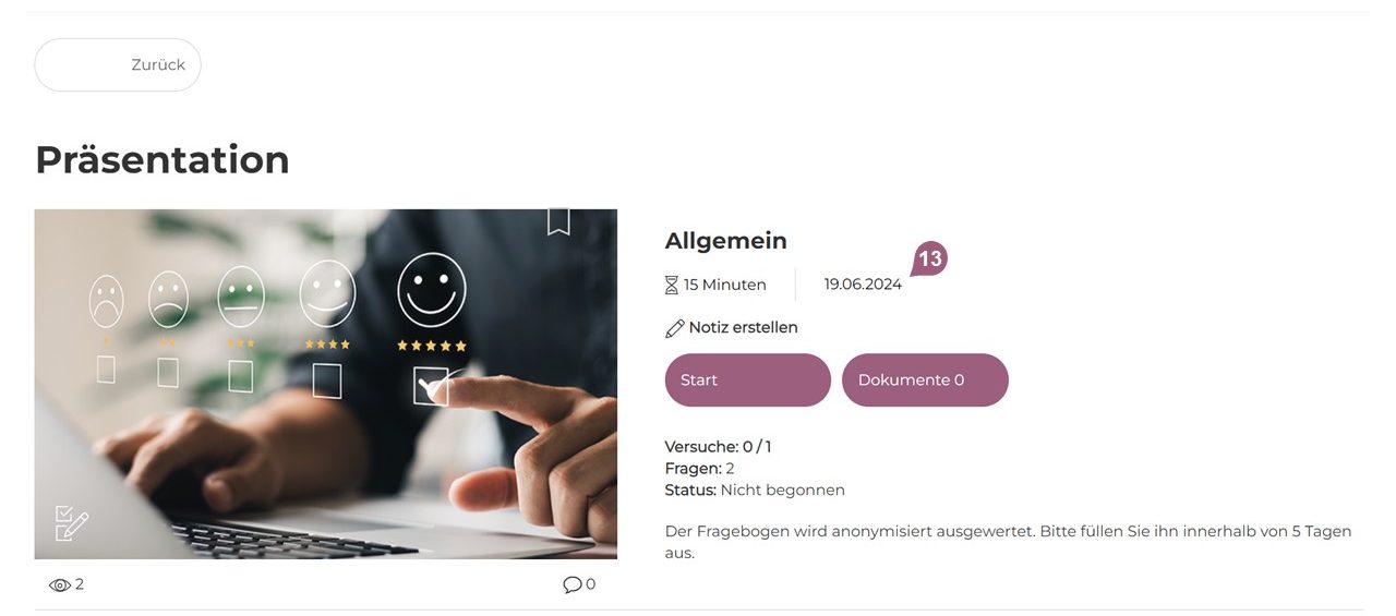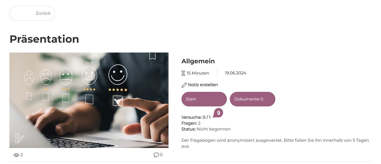 (9) Die Versuche in der Feedbackübersicht der Lernenden zeigen an, wie oft eine Person das Feedback starten kann. Als Versuche zählt auch das Abbrechen des Feedbacks. Wenn die Anzahl an vorhandenen Versuchen ausgeschöpft wurde, hat der Lernende keinen Zugriff mehr auf dieses Feedback. Ist die Anzahl der Versuche eingeschränkt, haben die Lernenden beim Abschluss des Feedbacks nochmal die Möglichkeit ihre Antworten zu kontrollieren, bevor sie den Feedbackbogen abgeben. Sind die Versuche unendlich, so wird der Feedbackbogen direkt abgeschlossen.