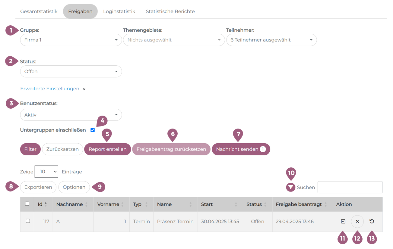 Im Statistikbereich unter Administration > Benutzer > Statistiken > Verwaltung > Freigaben erhalten Sie eine Übersicht über den Status aktueller Freigaben. Dort stehen Ihnen folgende Optionen zur Verfügung: (1) Filter nach Gruppen, einzelnen Feedbacks, Themengebieten und Benutzern (2) Filter nach Status der Freigaben (Bestätigt / Abgelehnt / Offen / Zurückgesetzt) Unter „Erweiterte Einstellungen”: (3) Filter nach Benutzerstatus (aktiv / inaktiv / alle) (4) Option „Untergruppen einschließen”: Wenn diese Funktion deaktiviert ist, werden nur Ergebnisse für exakt die Gruppe, die unter (1) ausgewählt wurde, angezeigt. (5) Es ist zudem möglich, eine Auswahl von Filtern durch Klick auf „Report erstellen” zu speichern. Gespeicherte Reports ermöglichen es, eine bestimmte Filter-Einstellung im Tab „Statistische Berichte” jederzeit mit einem Klick wieder zu öffnen. Dies bietet sich an, wenn eine bestimmte Auswertung regelmäßig erstellt werden muss und vermeidet, dass jedes Mal alle Filter erneut ausgewählt werden müssen. (6) Über den Button „Freigabeantrag zurücksetzen“ können ein oder mehrere Freigabeanträge – unabhängig davon, ob sie noch offen, bereits bestätigt oder abgelehnt sind – zurückgesetzt werden. (7) Über den Button „Nachricht senden“ kann den Benutzern basierend auf den gewählten Filtern direkt eine Nachricht gesendet werden. (8) Über den Export-Button lassen sich die Ergebnisse als Excel-Datei exportieren. (9) Über den Button „Optionen“ können die Sichtbarkeit sowie die Reihenfolge der Spalten angepasst werden. (10) Mit dem Filtersymbol ist es möglich, jede Spalte individuell zu filtern, um gezielter suchen zu können. (11–13) In der Spalte „Aktion“ können einzelne Freigaben wie folgt bearbeitet werden: bestätigen über die Checkbox, ablehnen über das „X“-Symbol, zurücksetzen über das Pfeil-Symbol.Freigabestatistiken