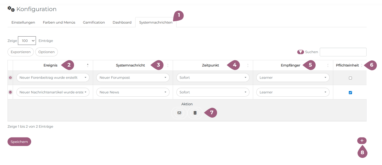 Ab Version 5.1 ist es möglich, automatische Systemnachrichten unabhängig von Lerneinheiten zu versenden. Dies erfolgt über den neuen Reiter „Systemnachrichten“ unter Einstellungen > Konfiguration (1).