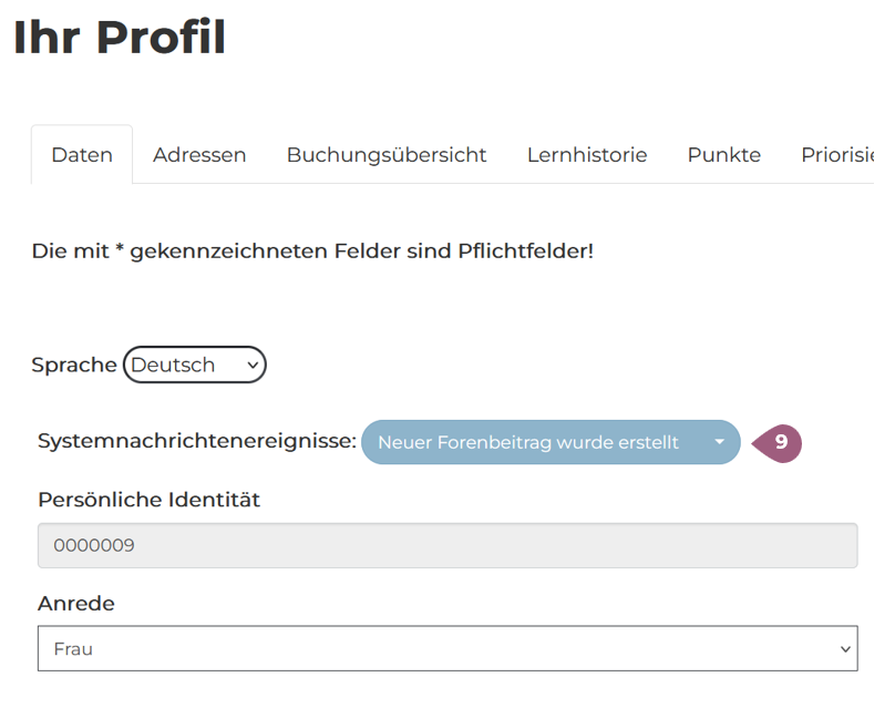 Globale Systemnachrichten funktionieren wie ein Abonnement für Benutzer. Diese müssen sich für die Nachrichten einwilligen. Dafür gibt es ein neues Dropdown-Menü im Benutzerprofil: das „Systemnachrichtenereignisse“-Menü (9).