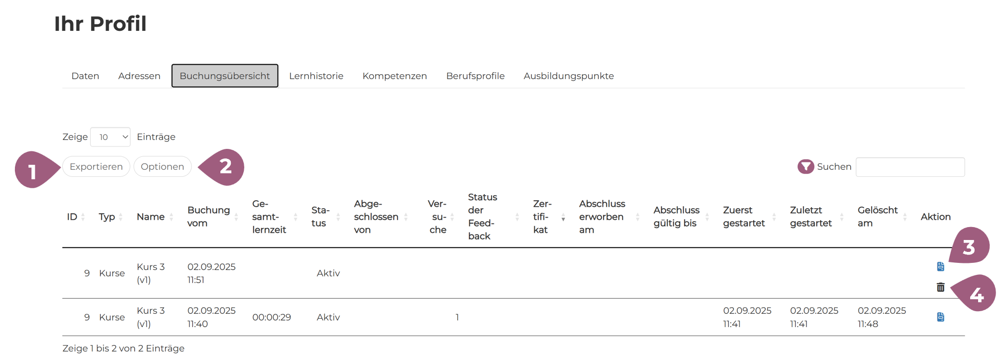 Ein Klick auf das Mülleimer-Symbol setzt die Buchung auf „abgelaufen“ (4). Die Lerneinheit bleibt für den Benutzer weiterhin sichtbar, jedoch kann er sie nicht mehr fortsetzen.