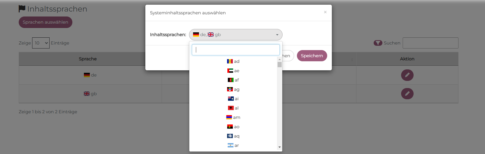 Durch den Klick auf den Button „Sprachen auswählen” (4) öffnet sich ein Pop-Up-Fenster. Über das Drop-Down-Menü können Sie hier die Sprachen wählen, die Sie als Inhaltssprachen aktivieren möchten.