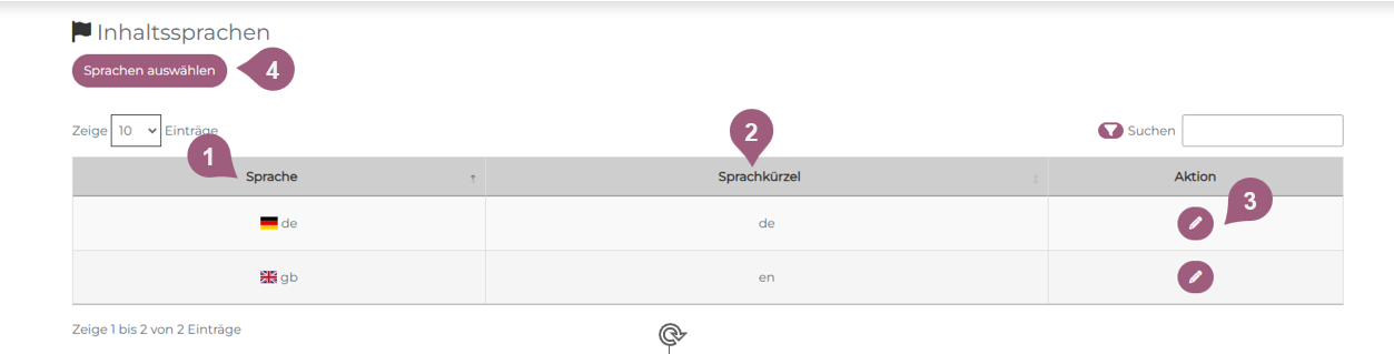 In der Übersicht sind die aktuell ausgewählten Sprachen (1) und deren Sprachkürzel (2) zu sehen. Im Editiermodus (3) lässt sich dieses Kürzel auch anpassen.