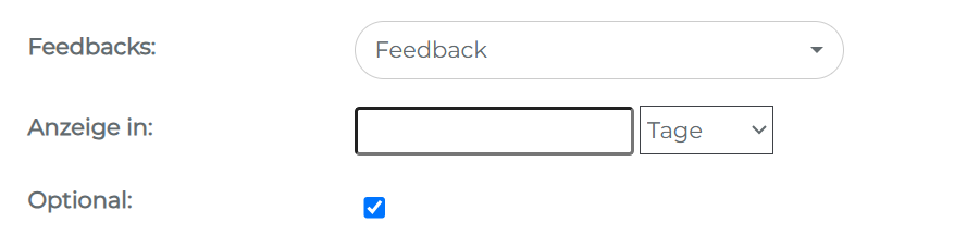 (22) Feedbacks können über Administration > Inhalt > Feedbacks erstellt und zum Ende des Inhalts eingebunden werden. Das Feedback, welches Sie einbinden möchten, können Sie über das Dropdown-Menü auswählen. Sie können in Stunden oder Tagen angeben, wann das Feedback angezeigt werden soll. Der Fragebogen wird dann je nach angegebener Zeit automatisch vom System freigeschaltet. Folgend können Sie angeben, ob das Ausfüllen des Fragebogens optional oder verpflichtend absolviert werden muss, um den Inhalt als abgeschlossen werten zu können.