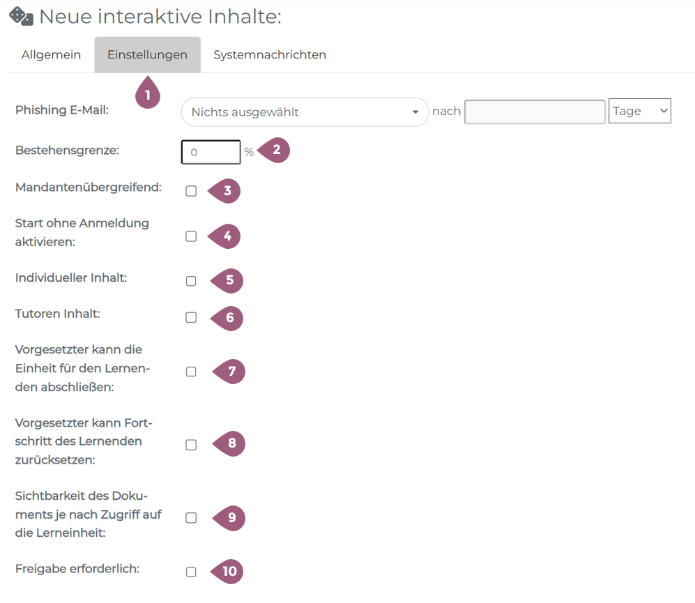 (4) Wenn “Start ohne Anmeldung” Einstellung aktiviert ist, können Besucher der Homepage die Lerneinheit einsehen und absolvieren, ohne sich beim LMS anmelden zu müssen. Die Daten nicht angemeldeter Nutzer werden weder in Statistiken noch im Lernhistorie erfasst.