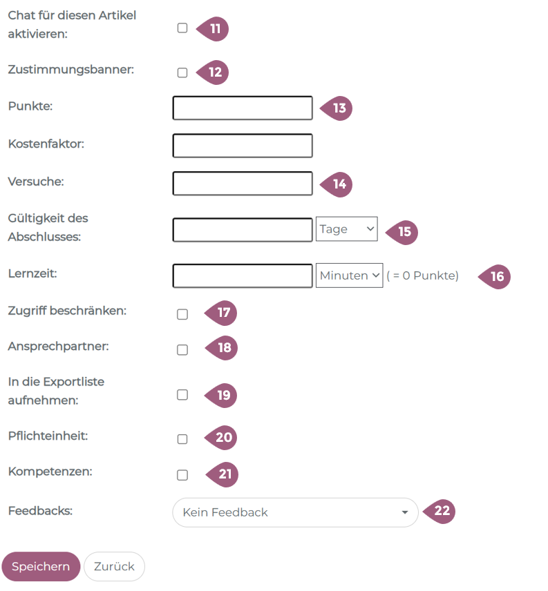 (16) Die hier eingestellte Lernzeit (in Minuten) wird den Lernenden in der Detailansicht des jeweiligen Inhalts angezeigt und dient als Richtwert, wie lange die Bearbeitung des Inhalts voraussichtlich dauert. Hier werden die Ausbildungspunkte angezeigt, die mit dem interaktiven Inhalt erworben werden können.