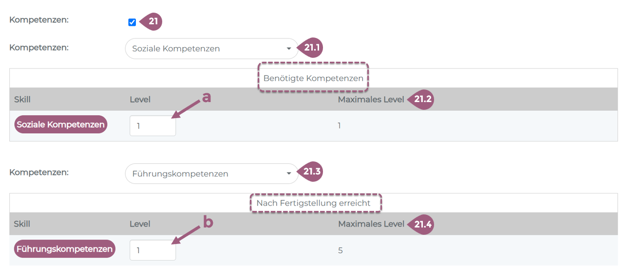 (21) Über diese Checkbox wählen Sie die Kompetenzen aus, die die Lernenden als Voraussetzung zum Beginn des Inhalts benötigen sowie die Kompetenzen, welche die Lernenden nach erfolgreicher Fertigstellung des Inhalts erhalten. Die vorausgesetzten Kompetenzen (20.1) und die erworbenen Kompetenzen (20.2) können Sie mit Hilfe des Dropdown-Menüs auswählen. Sie haben die Möglichkeit, ein Level anzugeben, welches erreicht sein muss (a) bevor teilgenommen werden kann bzw. (b) welches erreicht wird nachdem teilgenommen wurde. Das maximale Level dabei zeigt an, wie viele Level erreicht sein müssen (20.3) bzw. erreicht werden können (20.4). Kompetenzen können Sie über Administration > Einstellungen > Kompetenzen hinterlegen. Wenn Sie einzelne Kompetenzen entfernen möchten, können Sie diese über das Dropdown-Menü abwählen. Wenn Sie alle Kompetenzen deaktivieren möchten, entfernen Sie das Häkchen für Kompetenzen und speichern den Vorgang ab.