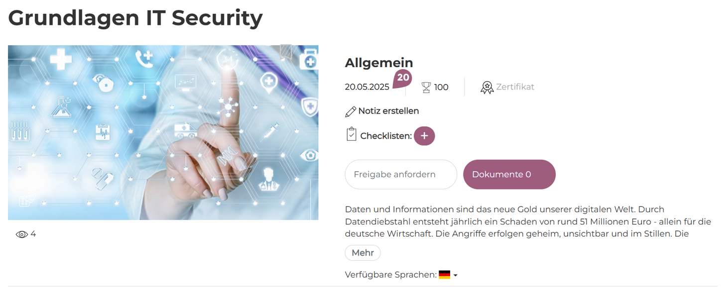 (10) Wenn für einen Inhalt die Option „Freigabe erforderlich“ aktiviert wird, muss die jeweilige Freischaltung für diesen Inhalt zuerst durch Vorgesetzte erteilt werden, bevor die Lernenden diesen beginnen können. Anstelle des „Starten“-Buttons wird in diesem Fall das Feld „Freigabe anfordern“ angezeigt, über welches bei der im LMS hinterlegten Führungskraft die Freigabe beantragt werden kann. Die Führungskraft erhält daraufhin eine Benachrichtigung im LMS sowie – je nach Konfiguration – auch per E-Mail. Der User wird unmittelbar nach der Entscheidung seines Vorgesetzten per Nachricht darüber informiert und kann nach erteilter Freigabe direkt beginnen, den interaktiven Inhalt zu absolvieren.