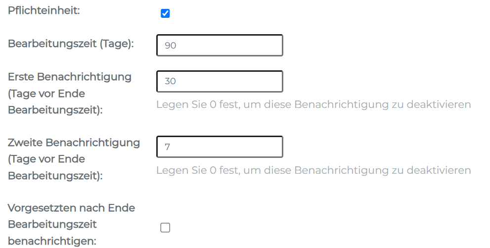 (20) Wenn die Pflichteinheit-Funktion aktiviert ist, erhalten die Lernenden eine Benachrichtigung, sobald der interaktive Inhalt für sie verfügbar ist und bis wann es abzuschließen ist. Der gewünschte Bearbeitungszeitraum sowie die Frequenz der Reminder-Nachrichten lässt sich individuell angeben. Ebenso können Sie einstellen, dass Vorgesetzte nach Ende des Bearbeitungszeitraums benachrichtigt werden. Sobald Sie das Häkchen gesetzt haben, können Sie angeben wann der Lernende benachrichtigt werden soll. Hierbei gibt es drei Stufen, der Lernende wird zwei Mal darüber benachrichtigt, dass er der interaktive Inhalt noch absolvieren muss. Beim dritten Mal können Sie angeben, ob der Vorgesetzte ebenfalls benachrichtig werden soll.