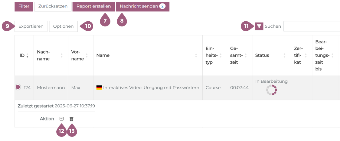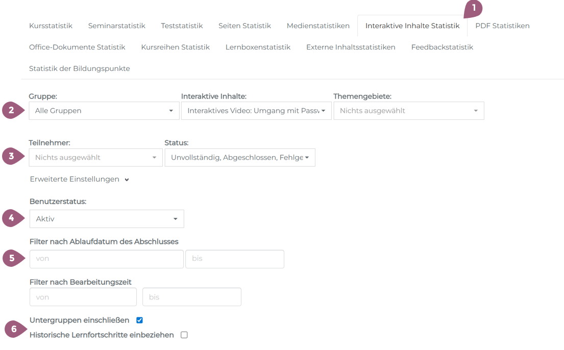 (6) Option “Historische Lernforschritte einbeziehen”: Wenn diese Funktion aktiviert ist, werden auch abgelaufene Abschlüsse angezeigt.